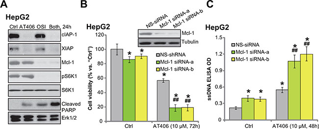 Figure 5: OSI-027 downregulates Mcl-1 to overcome AT406’s resistance. HepG2 cells were treated with AT406 (10 μM) or plus OSI-027 (“OSI”, 100 nM), cells were further cultured for indicated periods of time, expression of listed proteins was tested by Western blotting assay (A). HepG2 cells transfected with scramble non-sense control siRNA (“NS-siRNA”) or Mcl-1 siRNA (“-1/-2”, 200 nM each, 24 hours) were stimulated with AT406 (10 μM) for indicated periods of time, Mcl-1 expression (B, upper panel); Cell viability (B, lower panel) and cell apoptosis (C) were tested. *indicated statistically significant differences as compared to “Ctrl” group. ##indicated statistically significant differences as compared to “NS-siRNA” group.