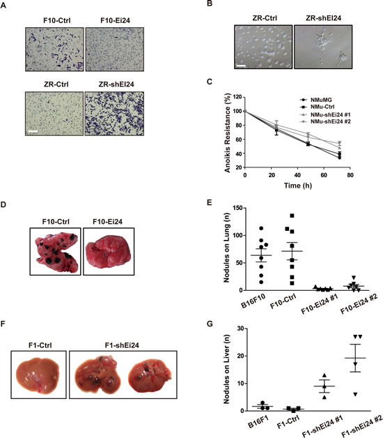 Figure 3: Knockdown of EI24 promotes malignant characteristics that accompany EMT. (A) The indicated cell lines were added to Matrigel-coated transwell inserts, and invading cells were visualized after 16 hours by crystal violet staining. Scale bar represents 200 μm. (B) Formation of invasive acini was evaluated using the 3D matrigel assay. The data are representative of at least two independent experiments. Scale bar represents 100 μm. (C) NMuMG Parental, NMuMG-Ctrl and NMuMG-shEi24 cells were maintained in suspension using ultra-low-attachment plates and cell viability was analyzed at the indicated time points. (D) and (E) F10-Ctrl or F10-EI24 cells were intravenously injected into C57BL/6NTac mice and specific metastatic ability was analyzed by counting nodules in the lungs; n ≥7; one-way analysis of variance, p <0.0001. (F) and (G) F1-Ctrl or F1-EI24 cells were intravenously injected into C57BL/6NTac mice and their specific metastatic ability was analyzed by counting nodules in the liver; n ≥3; one-way analysis of variance, p <0.01.