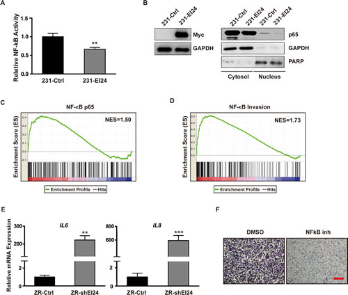 Figure 4: NF-κB activation and upregulation of genes involved in inflammation-induced tumor progression by EI24 knockdown. (A) The transcriptional activity of NF-κB in control and EI24-overexpressing MDA-MB-231 cells was evaluated using a NF-κB luciferase reporter assay. Data shown are mean ± S.D. n = 6, **p <0.0001. (B) Immunoblot analysis of p65 expression levels in nuclear extracts from control and EI24-overexpressing MDA-MB-231 cells. (C) and (D) GSEA for gene signatures in EI24 knockdown cells indicating genes that contain p65-binding sites in their promoter regions (p <0.001; C) and genes that are targets of NF-κB and are associated with tumor invasiveness (p <0.001; D). NES, normalized enrichment score. (E) Relative mRNA expression levels of the indicated genes in control and ZR-shEI24 cells analyzed by real-time qPCR. Data shown are the mean ± S.D. of two independent experiments with each sample assayed in triplicate; P values were calculated by unpaired t-test using GraphPad Prism software. *p <0.005, **p <0.0001, ***p <0.0005. (F) Cell migratory potential was measured after treatment of ZR-shEI24 cells with an NF-κB inhibitor. The red scale bar represents 200 μm.