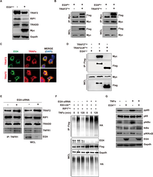 Figure 5: EI24 binds to and promotes degradation of Complex I components, thus inhibiting downstream signaling. (A) Immunoblot analysis of degradation of TRAF2, RIP1, and TRADD induced by EI24. (B) Interaction between EI24 and TRAF2/5 in 293T cells assessed using immunoprecipitation. (C) Colocalization of EI24 with TRAF2/5 in HeLa cells. Scale bar represents 10 μm. (D) Immunoprecipitation experiments showing that the RING domain of TRAF2 is required for its interaction with EI24. (E) siRNA-mediated knockdown of EI24 increases the binding of TRAF2 to TNFR1. Binding of TNFR1 with TRAF2, TRADD, and RIP1 was examined in control and EI24 knockdown 293T cells. WCL, whole cell lysate. (F) EI24 knockdown results in accumulation of K63-linked RIP1. RIP1-K63 ubiquitination was examined in the presence of TNFα at the indicated time points. (G) Downstream molecules of Complex I-mediated signaling were evaluated upon EI24 overexpression. Levels of phospho (p)-IKKα/β, p-IκBα, IκBα, p-p65, and p65 in MDA-MB-231 cells were determined by immunoblotting.