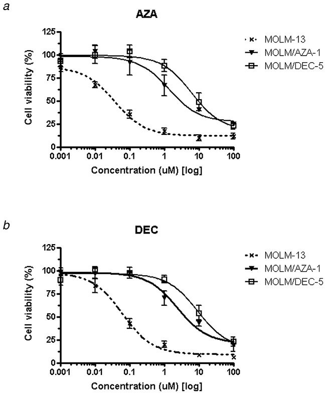 Table 1: The IC50 of hypomethylating agents (HMAs) in MOLM-13 and MOLM-13-derived HMA-resistant cell lines (MOLM/AZA-1 and MOLM/DEC-5)