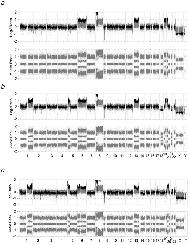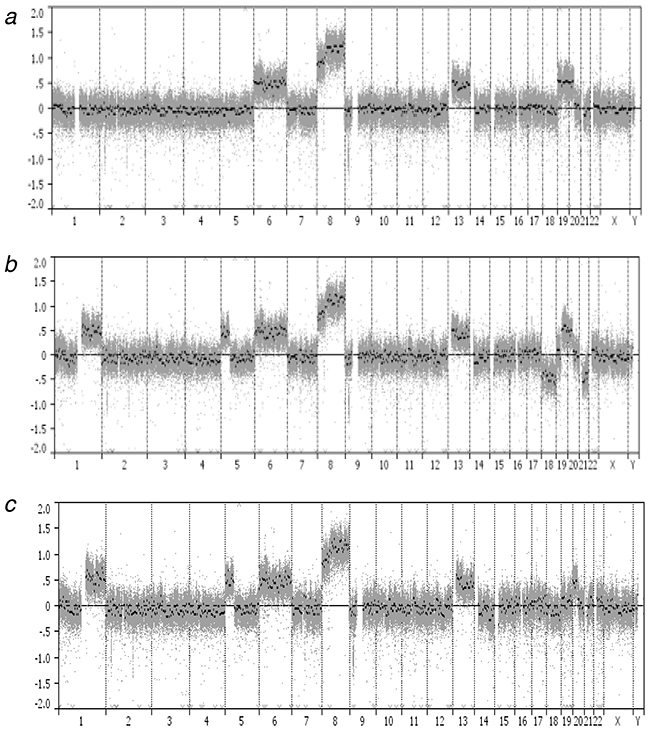 Figure 2: Genome-wide profiles of chromosomal alterations. The x-axis represents individual chromosomes and the y-axis represents signal intensity ratio (each cell line genome/pooled normal genome) on a log2 scale. a. MOLM-13, b. MOLM/AZA-1, c. MOLM/DEC-5.