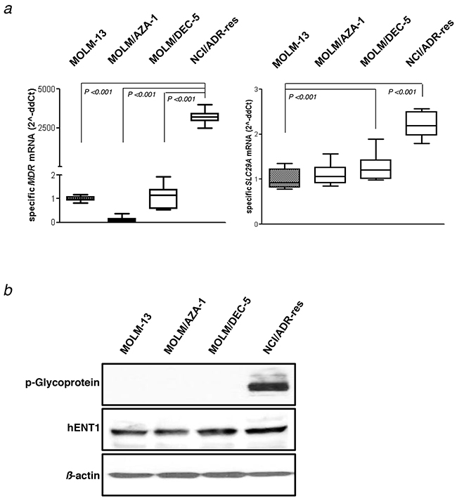 We evaluated the expression of the resistant genes, P-glycoprotein (Pgp) and hENT1 in HMA-resistant cell lines (Figure 5). Pgp, encoded by the MDR1 gene, is an ATP-dependent efflux pump with broad substrate specificity, and hENT1, encoded by the SLC29A gene, is an equilibrative nucleoside transporter family. As a positive control of MDR1 and Pgp expression, we used an NCI/ADR-Res cell line. Expression level of MDR1 gene in MOLM-13 (1.0 fold), MOLM/AZA-1 (0.1 fold) and MOLM/DEC-5 (1.1 fold) was significantly lower than those of NCI/ADR-Res (3241.9 fold). The protein expressions of Pgp reflected the gene expressions of the cell lines (Figure 5b). SLC29A gene expressions and hENT levels were not significantly different between MOLM-13 and HMA-resistant cell lines (Figure 5b). These results indicate that development of HMA resistance in our cell lines was not related to increase of Pgp or hENT1 activities.