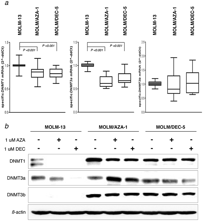 Figure 6: Expression of DNMT family proteins. a. mRNA expression of the DNMT1, DNMT3a, and DNMT3b genes using real-time quantitative polymerase chain reaction assay. Results are presented as the expression relative to beta-actin mRNA expression. Values are mean ± SEM for three independent experiments. b. Protein expression of DNMT1, DNMT3a, and DNMT3b pre- and post-treatment with azacitidine or decitabine for 48 h. β-Actin was measured as a loading control.