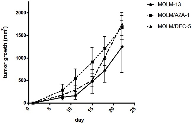 Figure 7: Establishment of HMA-resistant xenograft models. The x-axis denotes days after subcutaneous injection of MOLM-13, MOLM/AZA-1, or MOLM/DEC-5 cells into Balb/c nu/nu mice (n=7 per cell line), and the y-axis denotes tumor volume. Tumor volume was monitored twice a week for 3 weeks. HMA-resistant cell lines showed more aggressive increases in tumor volume around 22 days compared to the parental MOLM-13 cell line. Data are shown as means ± SEM.