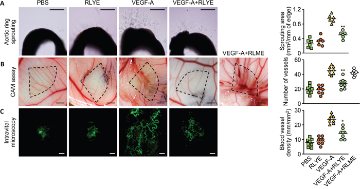 Figure 1. RLYE inhibits angiogenesis ex vivo and in vivo. A. Rat aortic rings were incubated with VEGF-A, RLYE or combined together. On day 6, newly formed vessels were fixed and microvessel outgrowth was photographed under a phase contrast microscope. Scale bar, 200 μm. B. Thermanox discs containing VEGF-A, RLYE, VEGF-A plus RLYE or VEGF-A plus RLME were loaded onto the CAM of 10-day-old embryos. After 72 h incubation, the area around the loaded disc was photographed. Scale bar, 2 mm C. Matrigel containing VEGF-A alone or in combination with RLYE was applied to the inner space of window, which was surgically implanted between the skin and abdominal wall of mice. After 4 days, neovascularization was recorded using a fluorescence microscope after intravenous injection of FITC-labeled dextran. Angiogenesis was assessed as described in the Methods section. Scale bar, 200 μm. Data are the mean ± SD (n ≥ 6). * P < 0.05 and **P < 0.01 versus VEGF-A alone.