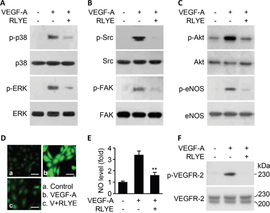 Figure 2: RLYE inhibits VEGF-A-induced angiogenic signal cascades. HUVECs were treated with VEGF-A (10 ng/ml) alone or in combination with RLYE (0.15 nM) for 30 min, except for measurement of NO in cells that were incubated for 4 h. Cell lysates were separated by SDS-PAGE, followed by Western blotting to determine the phosphorylation levels of p38MAPK and ERK A. Src and FAK B. Akt and eNOS C. and VEGFR-2 (F). D and E. The levels of intracellular NO were determined by confocal microscopy using DAF-FM. Scale bar, 50 μm. F. Two VEGFR-2 bands with MW of 220 and 230 kDa indicate intermediate and mature forms, respectively. Data are the mean ± SD (n = 6). **P < 0.01 versus VEGF-A alone.