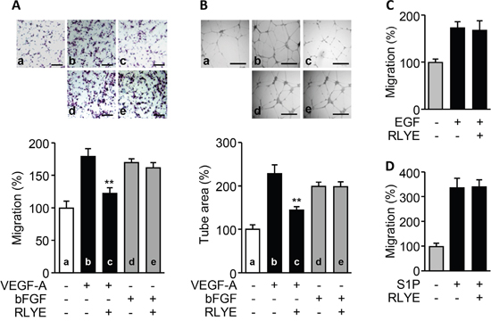 Figure 3: RLYE inhibits in vitro angiogenesis induced by VEGF-A, but not bFGF, EGF, and S1P. HUVECs were incubated with VEGF-A (10 ng/ml), bFGF (10 ng/ml), EGF (20 ng/ml) or S1P (1 nM) in the presence or absence of RLYE (0.15 nM). A. Endothelial cell migration was determined by the Boyden chamber assay. Cells that migrated to the lower side of the filter were counted. Scale bar, 100 μm. B. Images of tube-like structure were photographed using an inverted phase contrast microscope, and the tube length was quantified using Image-Pro Plus software. Scale bar,500μm. C and D. Endothelial cell migration was determined by Boyden chamber assay. Data are the mean ± SD (n = 3). **P < 0.01 versus VEGF alone.