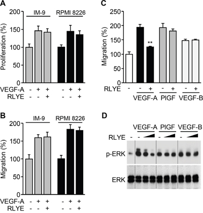 Figure 4: RLYE inhibits in vitro angiogenic events induced by VEGFR-2, but not VEGFR-1. A. and B. IM-9 and RPMI 8226 cells were incubated VEGF-A alone or in combination with RLYE. (A) Cell proliferation was determined by [3H]-thymidine incorporation assay. (B) Endothelial cell migration was determined by Boyden chamber assay. C and D. HUVECs were incubated with VEGF-A (10 ng/ml), PlGF (20 ng/ml) or VEGF-B (20 ng/ml) in the presence or absence of RLYE (0.15 nM). (C) Endothelial cell migration was determined in a Boyden chamber. (D) ERK phosphorylation was determined by Western blotting. Data are the means ± SD (n = 3). **P < 0.01 versus VEGF-A alone.