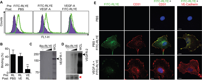 Figure 5: RLYE binds to endothelial cells through binding to VEGFR-2. A and B. HUVECs were incubated with FITC-conjugated RLYE (RL, 15 nM) before or after treatment with VEGF-A (VE, 100 ng) for 30 min. Cells were analyzed by flow cytometry (A) and quantified (B). Data are the means ± SD (n = 5). **P < 0.01 versus RLYE alone. C and D. HUVEC lysates were incubated with biotinylated RLYE (Bio-RLYE, 0.15 or 1.5 nM), followed by precipitation with streptavidin-agarose beads. The red arrow indicates VEGFR-2 protein bands on a longer exposure film. The precipitates were separated by SDS-PAGE. VEGFR-2 or VEGFR-1 expression was assessed by Western blot analysis. E. HUVECs were treated with or without VEGF-A (10 ng/ml) for 30 min, followed by incubation with FITC-conjugated RLYE (100 ng/ml, green). Cells were incubated with a TRITC-conjugated CD31 antibody (1:100, red) or DAPI (blue). Confocal microscopy was performed for analyzing binding of RLYE on HUVECs. Scale bar, 10 μm.