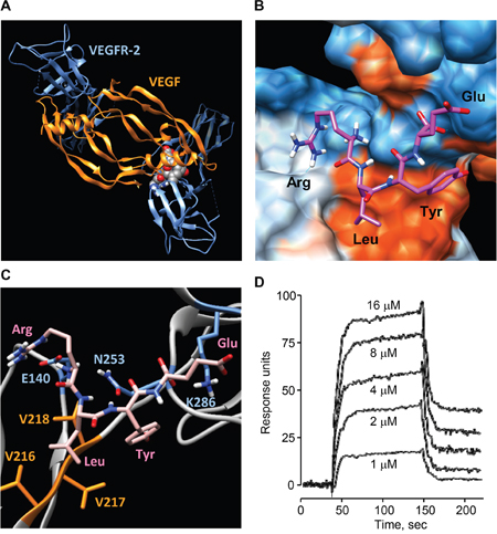 Figure 6: Binding of RLYE to VEGFR-2. A. In silico molecular docking structure of the RLYE peptide (red spheres) bound at the interface between VEGFR-2 (blue) and VEGF (orange). B. Binding model of RLYE to VEGFR-2. Red and blue colors represent hydrophobic and hydrophilic regions, respectively. C. Interaction of the RLYE peptide (pink) with VEGFR-2. The residues E140, N253, and K286 (blue) of VEGFR-2 are involved in electrostatic interaction and hydrogen bonding with Arg and Glu of the RLYE peptide whereas Val residues (orange) participate in hydrophobic interaction Leu of the peptide. D. SPR analysis was performed for determining the interaction between RLYE and rhVEGFR-2.