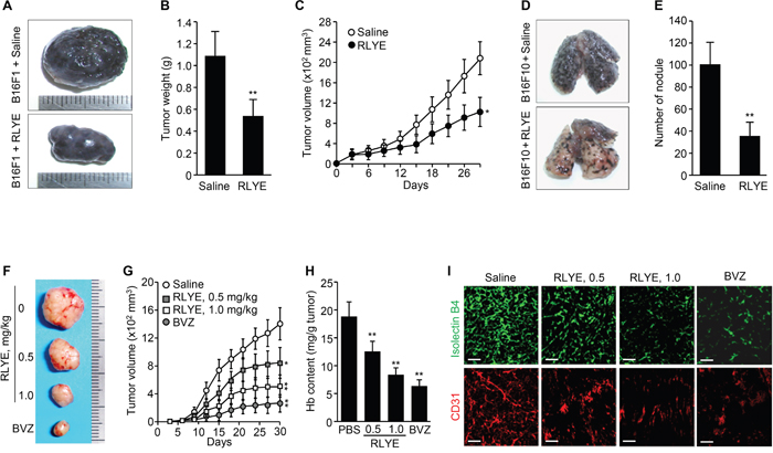 Since VEGFR-2 is critically involved in tumor angiogenesis [18], we next evaluated the pharmacological effects of RLYE on tumor progression in a mouse model. B16F1 melanoma cells were injected s.c. into the flanks of mice, and tumor-bearing mice were injected i.p. with RLYE at a dose of 1 mg/kg/day. Treatment with RLYE resulted in a significant decrease of tumor size, weight, and growth (Figure 7A-7C). To explore the inhibitory effect of RLYE on tumor metastasis in vivo, mice were injected with B16F10 melanoma cells into the tail vein and injected i,p. with RLYE at a dose of 1 mg/kg/day. Three weeks later, metastatic colonies were analyzed in the lungs. Administration with RLYE resulted in a 62% reduction in number of metastatic colonies in the lungs compared with untreated control mice (Figure 7D and 7E). These results suggest that RLYE is capable of inhibiting tumor growth and metastasis.