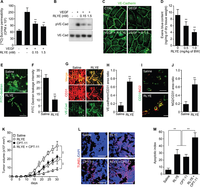 Figure 8: RLYE inhibits vascular leakage and enhances tumor chemosensitivity. A. Endothelial cell permeability was determined by diffusion of [14C]-sucrose through HUVEC monolayers treated with 20 ng/ml of VEGF alone or in combination with RLYE (n = 3). B. Phosphorylation of VE-cadherin was determined in cell lysates of HUVECs treated with 20 ng/ml of VEGF alone or in combination with RLYE. C. Immunostaining of VE-cadherin in endothelial monolayer was determined by confocal microscopy. D-J. HCT116 tumor-bearing mice (n = 5 per group) were injected with saline or RLYE (0.5 mg/kg) for 12 days. Tumor vascular leakage was determined by the Evans blue method (E and F) or FITC-dextran image assay (G and H). (G) Immunofluorescence staining of the tumor sections (n = 5) for CD31 and VE-cadherin, and (H) ratio of VE-cadherin to CD31 was quantified using computer-aided confocal microscopy. (I) Immunofluorescence staining of the tumor sections (n = 5) for CD31 and NG2, and (J) NG2-positive vessels were quantified. K-M. HCT116 tumor-bearing mice (n = 7 per group) were i.p. injected with RLYE (0.5 mg/kg/day) alone or in combination with irinotecan (CPT-11, 17 mg/kg every 5th day). (K) Tumor volumes were measured every 3 days. (L and M) Apoptotic cells in tumor tissues were determined and quantified by TUNEL staining. Scale bar, 100 μm in all images. **P<0.001 (Student’s t-test except survival curve data).