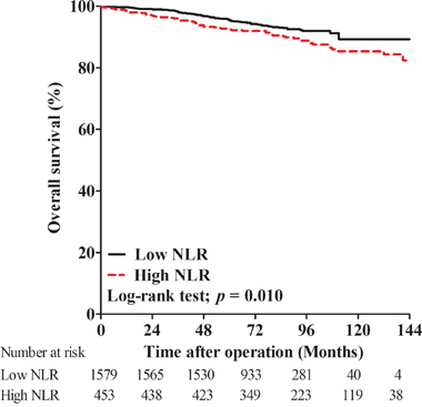 In the current study, 160 (7.9%) men died during follow-up due to all possible causes. Of these deaths, 103 (6.5%) patients were from the low NLR group and 57 (12.6%) were from the high NLR group. The 5-year OS rates of the low and high NLR groups were 95.4% and 92.5%, while the 10-year OS rates were 89.3% and 85.4%, respectively. Kaplan-Meier curves showed that OS for men with high NLR was worse than those with low NLR (log-rank test; p = 0.010, Figure 2).