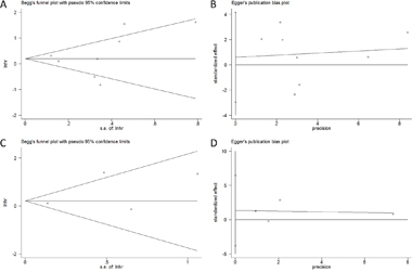 Figure 5: Publication bias in the meta-analysis. A. Begg’s test for OS; B. Egger’s test for OS; C. Begg’s test for DFS; D. Egger’s test for DFS.