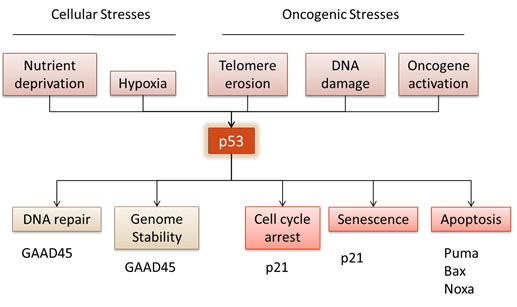 Figure 1: Tumour suppressor p53 regulates numerous cell responses. In response to cellular stresses, such as nutrient deprivation or hypoxia, or oncogenic stresses, such as telomere erosion, DNA damage or oncogene activation, p53 is activated triggering a wide range of signals.