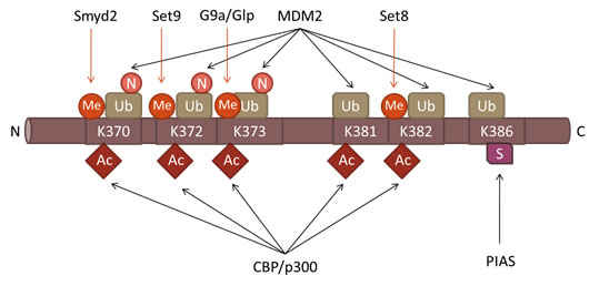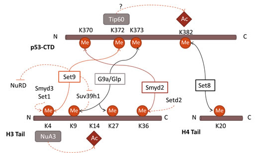 Recently, Huang and colleagues have reported that, in addition to acetylation and ubiquitylation, K373 of p53 can also be methylated by two homologous histone methyl- transferases, G9a and Glp [73]. The methylation level of K373 was not altered by DNA damage, which might suggest that di-methylation of K373 mediated by G9a/Glp correlates with inactive p53. In addition, simultaneous knockdown of G9a/Glp triggered apoptosis of tumour cells, further indicating that p53-K373me2 is a repressive mark [73]. However, is still unclear whether this cellular effect is a direct result of p53 K373 methylation, or whether it is caused by repressive methylation of histones in the promoters of pro-apoptotic target genes.