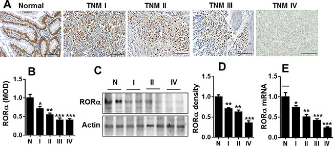 Figure 1: RORα was reduced in human gastric cancer. (A) Representative IHC results showing the expression of RORα in human gastric tissues adjacent to tumor (Normal, N) and with cancer from TNM I to TNM IV. Bar size: 100 μM. (B) The MOD showing the changes in RORα expression by immunohistochemistry in A. (C) Representative Western blots showing the changes of RORα levels in human gastric tissues adjacent to tumor (Normal, N) and with cancer from TNM I to TNM IV. β-actin was used a loading control. (D) The densitometry of RORα bands in C. Relative protein expression of RORα was normalized to that of β-actin. (E) The levels of RORα mRNA in human gastric tissues adjacent to tumor (Normal, N) and with cancer from TNM I to TNM IV, which was measured by qPCR. 18S rRNA was used a housekeeping gene. Data are expressed as the mean ± SEM. N = 3–6. *P < 0.05, **P < 0.01, ***P < 0.001, vs. Normal.