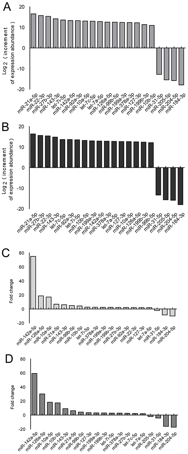 Corneal tissue for miRNA sequencing was harvested at 4 and 7 d after alkali-burn injury, which is the early stage of neovascularization. MiR-21 showed the greatest increment of abundance at both time points (Figure 1A, 1B) and exhibited a significant fold change at these time points (Figure 1C, 1D). We arranged the order of miRNA by increase in abundance because both the abundance and the fold change of miRNA are important factors.