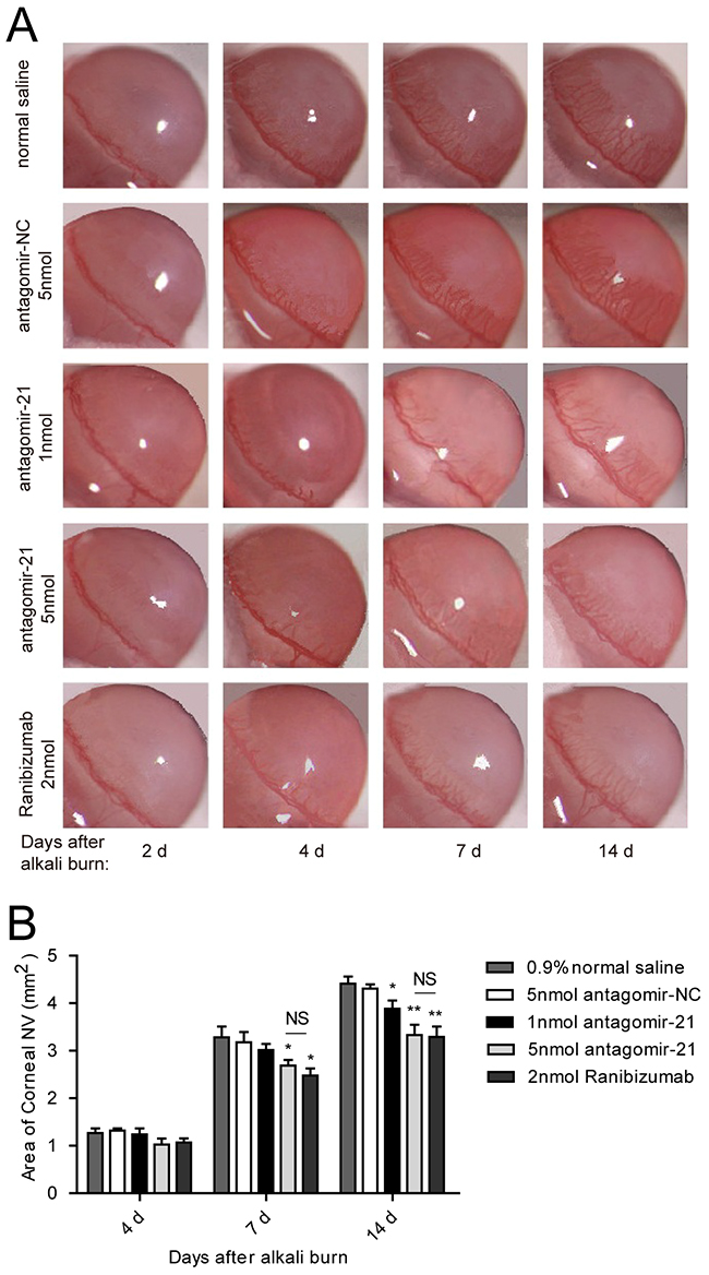 Figure 3: Effect of antagomir-21 on corneal neovascularization in the alkali-burned corneas. A. Representative gross images of eyes treated with antagomir-21 (1 nmol or 5 nmol per injection), negative (normal saline and antagomir-NC) or positive (ranibizumab) controls at 2, 4, 7, 14 d after injury. B. Neovascularization area of the cornea. Data are represented as mean +/- SEM. *P < 0.05, **P < 0.01 compared to antagomir-NC. NS, no significant difference between the indicated groups, n = 8 per group.