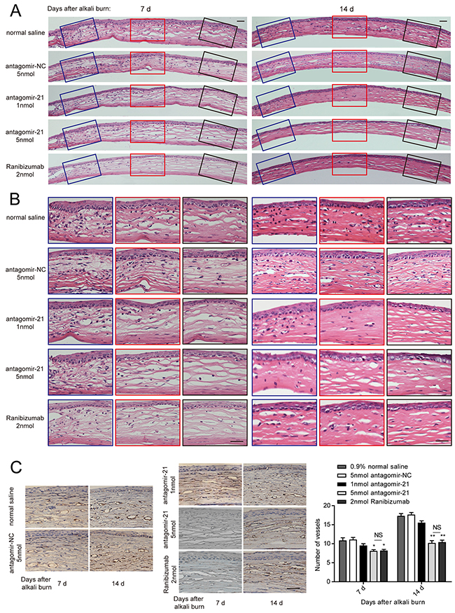 Figure 4: Histology of the cornea and the number of vessels revealed by CD31 immunostaining. A, B. Representative H&E staining of entire cornea (A) and enlarged image of the left, middle and right parts (B) treated with antagomir-21, the negative or positive controls at 7 and 14 d after injury. Scale bar: 20μm. C. Representative CD31 staining image and vessel number counting in the alkali-burned cornea. Scale bar: 20μm. Data are represented as mean +/- SEM. *P < 0.05, **P < 0.01 compared to antagomir-NC. NS, no significant difference between the indicated groups, n = 6 per group.