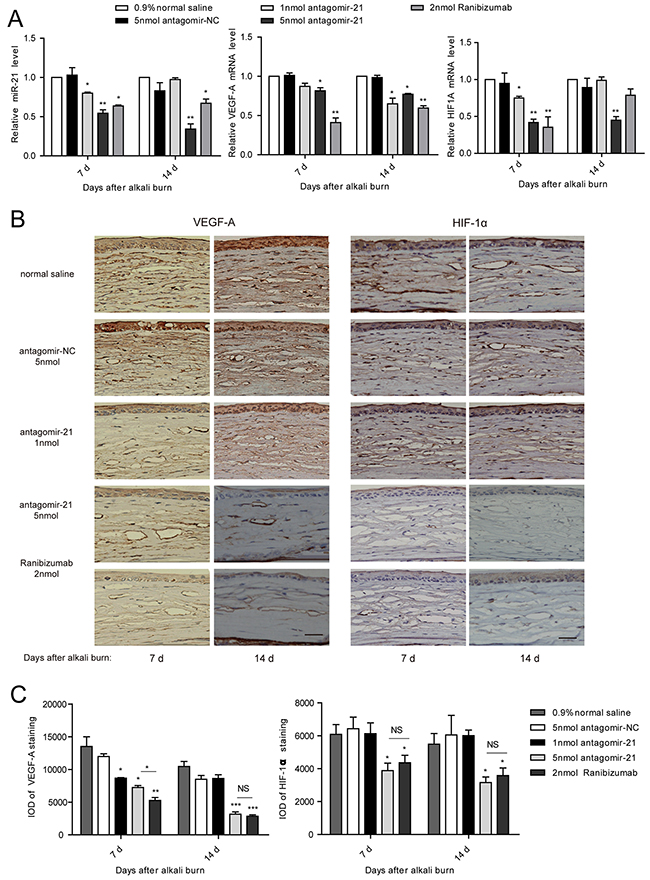 Successful inhibition of miR-21 was confirmed by the qPCR measurement of the miR-21 level in the antagomir-21-injected corneas compared with antagomir-NC. However, ranibizumab also effectively suppressed the miR-21 level possibly as a result of neovascularization regression (Figure 5A). To elucidate the anti-angiogenic effect of miR-21, we detected the expression change of VEGF-A and HIF-1α. Through qPCR analysis, we observed that the level of VEGF-A was downregulated at 7 d and further decreased at 14 d due to the injection of 5 nmol antagomir-21. Moreover, 5 nmol antagomir-21 showed a potent inhibitory effect on HIF1A mRNA expression. Treatment with 1 nmol antagomir-21 demonstrated inhibition of HIF1A at 7 d only and inhibition of VEGF-A at 14 d only. Ranibizumab significantly decreased VEGF-A mRNA levels at 7 d and 14 d but inhibited the HIF1A level at 7 d only (Figure 5A). To confirm the gene expression results, we performed an immunohistochemical staining. As observed in Figure 5B, VGEF-A and HIF-1α was significantly decreased in the antagomir-21 (5 nmol) cornea compared with the normal saline group. This inhibition was comparable to the inhibition induced by ranibizumab (Figure 5C).