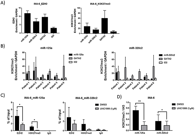 Figure 3: MiR-125a and miR-320c are polycomb targets in MM cell lines and primary cells as determined by ChIP-qPCR. A. EZH2 and H3K27me3 enrichment at miR-125a and miR-320c gene bodies in the MM INA-6 cell line. B. H3K27me3 enrichment at the miR-125a and miR-320c gene bodies in CD138+ myeloma cells purified from newly diagnosed patients. GATA2 and ID2 promoter regions were used as positive control for enrichments, while GAPDH promoter region was used as negative control. Enrichment was represented relative to the negative control, GAPDH. C. EZH2 inhibition using UNC1999 reduces the occupancy of EZH2 and H3K27me3 mark at miR-125a and miR-320c gene bodies. D. Reduced levels of H3K27me3 mark at miR-125a and miR-320c upon UNC1999 treatment was independent of total histone H3 levels. INA-6 cell line was treated with 1 μM of UNC1999 for 5 days. DMSO was used as control treatment. Error bars represent standard deviation of three independent biological experiments for cell lines and two technical qPCR runs for patient samples. P-values were calculated using student t-test GraphPad prism, P-value: *≤ 0.05; **≤0.01.