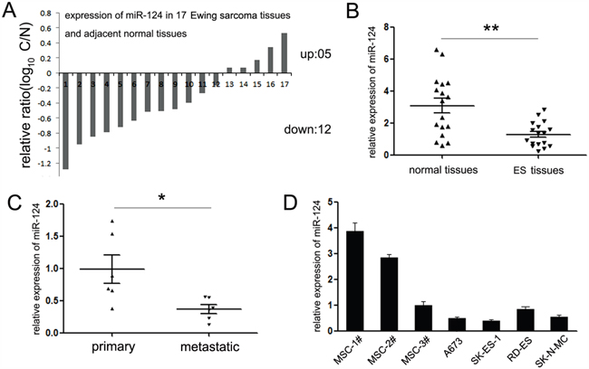 Figure 1: Expression of miR-124 in Ewing sarcoma specimens and cell lines. A. The expression of miR-124 in 17 paired of ES tissues and adjacent normal tissues was detected by quantitative RT-PCR. 12 cases of ES tissues showed suppressed expression of miR-124. Data are shown as log10 of relative ratio change of ES tissues relative to adjacent normal tissues; B. Statistical analysis of relative mean level of miR-124 expression in ES tissues and adjacent normal tissues. The mean level of miR-124 is much lower in ES tissues; C. Statistical analysis of relative miR-124 expression levels in primary ES tissues compared to the metastatic lesions. The expression of miR-124 was suppressed in metastatic lesions of ES tissues; D. The expression of miR-124 in three ES cell lines (A673, SK-ES-1, SK-N-MC and RD-ES) was analyzed relative to human mesenchymal stem cells (MSCs). The expression of miR-124 was significantly suppressed in A673, SK-ES-1 and SK-N-MC relative to all MSCs; all *P<0.05. In RD-ES cells, miR-124 was significantly suppressed compared with MSC1# and MSC2#; *P<0.05, except for MSC3# (P>0.05). The data are representative of at least three independent experiments. Error bars represent s.e.m. **P<0.01.