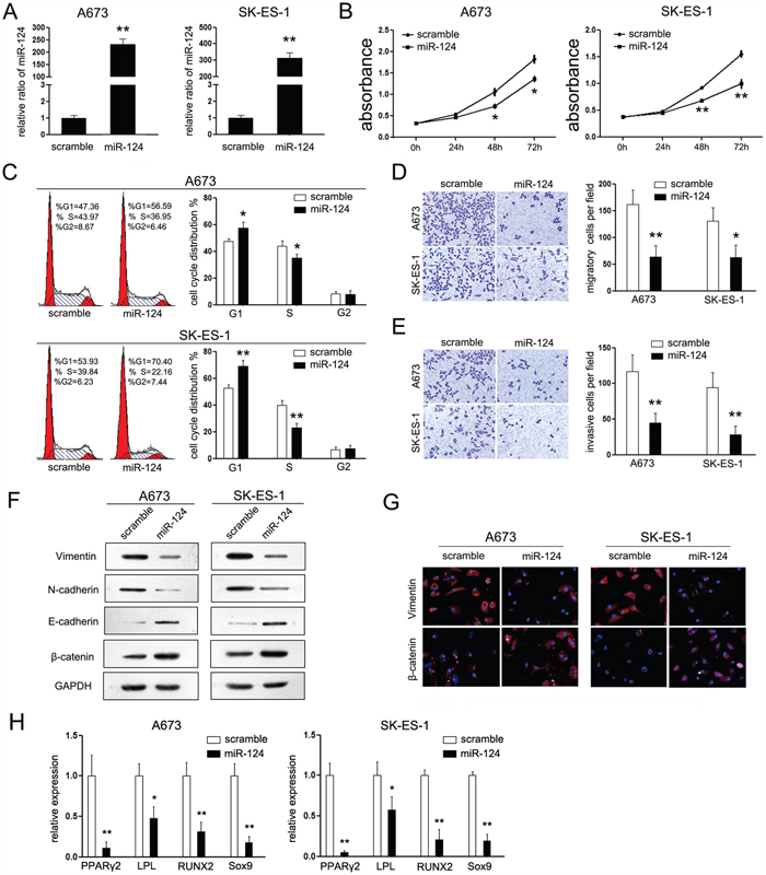Figure 2: MiR-124 suppresses cell proliferation, migration, and mesenchymal features of ES cells in vitro. A. RT-PCR was performed to detect the expression of miR-124 in ES cell lines (A673 and SK-ES-1) upon transfection with miR-124 mimic. Upon transfection with miR-124 mimic, the expression of miR-124 in both cell lines were increased; B. CCK-8 assays were performed to analyze the effect of miR-124 on cell proliferation of both cell lines. Transfection with miR-124 suppressed cell proliferation of both cells; C. Cell cycle analysis, by fluorescence-activated cell sorting (FACS) at 48h after transfection, were performed to analyze the effect of miR-124 on cell cycle progression of both cell lines. Upon transfection, the cell number of G1 phase was increased and which of S phase was decreased; D, E. The effects of miR-124 on cell migration and invasion were detected using trans-well chamber assays. Panel D showed the results on migration (×400); Panel E showed the results on invasion (×400). Cells transfected with miR-124 showed less cell number passing through the chambers in both conditions. F. Western blot analysis of the expression of epithelial and mesechymal marker proteins in ES cells transfected with miR-124 mimic was performed. G. Immunofluorescence staining assays were further used to detect the expression of Vimentin and β-catenin in ES cells. The expression of Vimentin (red) was suppressed in cells transfected with miR-124, while the expression of β-catenin (red) was increased in miR-124 group. H. RT-PCR was performed to detect the effects of miR-124 on the expression of PPAR2, LPL, RUNX2 and Sox9 upon transfection in different differentiation conditions. The data are representative of three independent experiments. Error bars represent s.e.m. *P<0.05; **P<0.01.