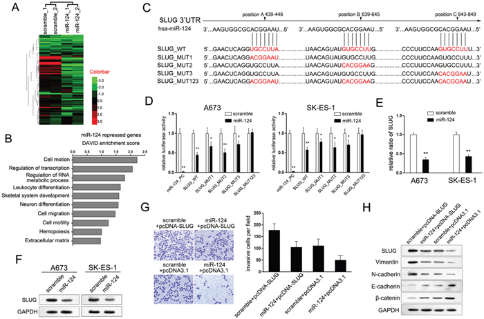 Figure 3: SLUG is involved in miR-124-mediated suppression of cell proliferation and invasion of ES cells. A. Heat-map showing the expression profiles significantly differentially expressed in A673 and SK-ES-1 cells upon treatment with miR-124. B. DAVID analysis of the expression profiles present in A. C. Schematic representation of SLUG 3’UTR showing putative miR-124 target sites. There exist three binding sites of miR-124 in the 3’UTR of SLUG; D. Relative luciferase activity of the indicated SLUG reporter construct in ES cells, co-transfected with miR-124 mimic or scramble mimic, is shown. Transfection of miR-124 significantly repressed the luciferase activity of SLUG, while mutant of each site showed partly abrogates the repression; E. Quantitation RT-PCR of the expression level of SLUG mRNA in ES cells treated with miR-124 mimic. Overexpression of miR-124 suppressed the mRNA expression of SLUG; F. Western blot analysis showed the expression level of SLUG protein in ES cells treated with miR-124 mimic. Overexpression of miR-124 suppressed the protein level of SLUG; G. Transwell assays were performed to detect the effects of SLUG on cell invasion of ES cells that have been treated with miR-124 before (×400). Restored the expression of SLUG partially abolished the suppressive effects of miR-124 on the invasion of ES cells; H. Western blot analysis showed the expression levels of SLUG, E-cadherin, N-cadherin, Vimentin and β-catenin in ES cells treated as described in C.