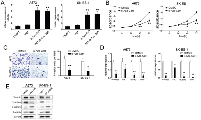 Figure 6: Treatment with 5-Aza-CdR duplicated the effects of miR-124. A. Relative expression of miR-124 upon treatment of 5-Aza-CdR and/or TSA. The expression of miR-124 was up-regulated in cells treated with 5-Aza-CdR but not TSA. B. CCK-8 assays analysis of proliferation rate of ES cells by 5umol/L 5-Aza-CdR. Treatment with 5-Aza-CdR suppressed the cell proliferation of ES cells; C. Trans-well chambers assays analysis of invasive ability of ES cells treated with 5umol/L 5-Aza-CdR. Cells treated with 5-Aza-CdR showed less number passing through the chambers; D. Western Blot analysis of specific epithelial and mesenchymal markers upon treatment with 5-Aza-CdR; E. Quantitative RT-PCR analysis of specific adipocytes, osteocytes and chondrocyte markers. The data are representative of three independent experiments. *P<0.05; **P<0.01.