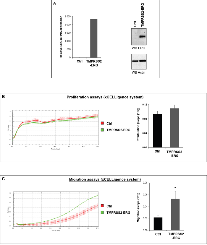 Figure 1: TMPRSS2-ERG fusion increases migration in prostate cancer cell line. A. ERG expression in PC3M-luc cell lines. Left panel: ERG expression was evaluated by RT-qPCR analysis. Transcript levels were measured following infection of PC3M-luc with pLPCX empty vector (Ctrl) or pLPCX TMPRSS2-ERG (TMPRSS2-ERG). Results are normalized with respect to endogenous control GAPDH. Immunoblot analysis of ERG protein levels in PC3M-luc Ctrl or TMPRSS2-ERG. Actin was used as a loading control. Primer used are avalaible in Supplementary Table S1. B. Left panel: Representative cell index (mean ± standard deviation) as a measure of PC3M-luc cell proliferation. Measurements were automatically collected by the RTCA DP analyser every 15 min for up to 3 days (n=2). Red: PC3M-luc cells infected with pLPCX empty vector (Ctrl); Green: PC3M-luc cells infected with pLPCX TMPRSS2-ERG vector (TMPRSS2-ERG). Right panel: Results of the cell proliferation assays represented as slopes (changes in cell index/hour) (n=4) (*= p<0,05). C. Left panel: Migration kinetics PC3M-luc cells assessed by continuous monitoring of live cell migration for approximately 24 hours. Red: PC3M-luc cells infected with pLPCX empty vector (Ctrl); Green: PC3M-luc cells infected with pLPCX TMPRSS2-ERG vector (TMPRSS2-ERG) (n=2). Right panel: Results of the cell migration assays represented as slopes (changes in cell index/hour) (n=4) (*= p<0,05).