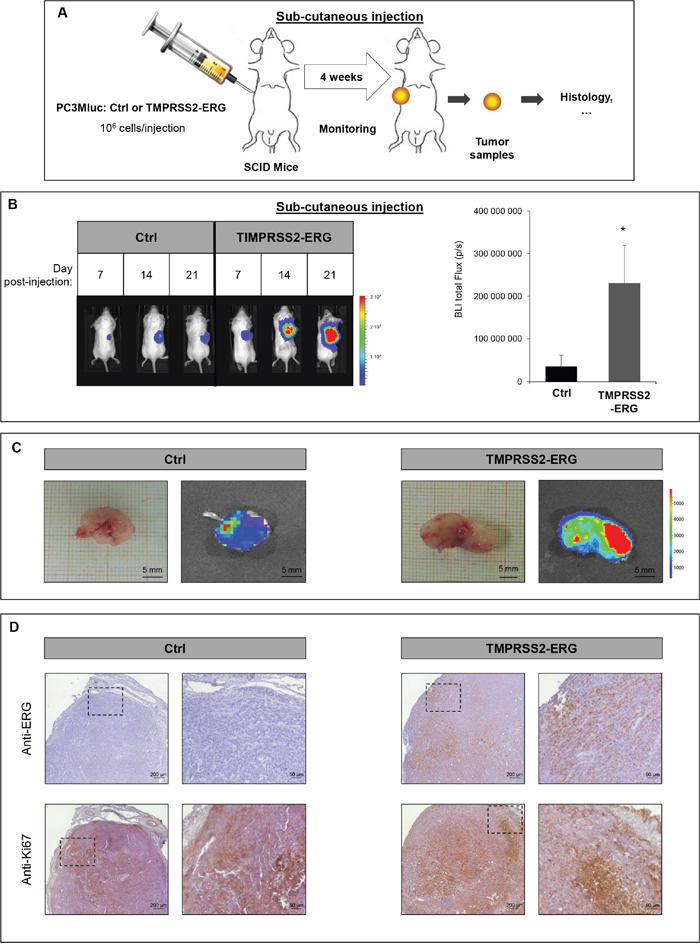 Figure 2: TMPRSS2-ERG fusion increases subcutaneous tumor growth. A. Schematic representation of subcutaneous injection experiments. B. Bioluminescence imaging of SCID mice bearing PC3M-luc tumor cells (Ctrl or TMPRSS2-ERG). Left panel: Representative pictures on the indicated days after subcutaneous injections. Luminescence is expressed in radiance (p/sec/cm2/sr) and represented by the color scale. Right panel: Quantitative analysis of the luciferase expression as a measure of tumor growth at the end of the experiment (day 24). Data represents the means of 6 mice in Ctrl group and 5 mice in TMPRSS2-ERG group. * indicated p<0,05. C. Picture of excised (up) subcutaneous tumor at day 24 and bioluminescence (BLI, bottom) D. Histologic analysis of subcutaneous tumors with anti-ERG antibody (up) and anti-Ki67 antibody (bottom). Magnified insert are shown on the right.