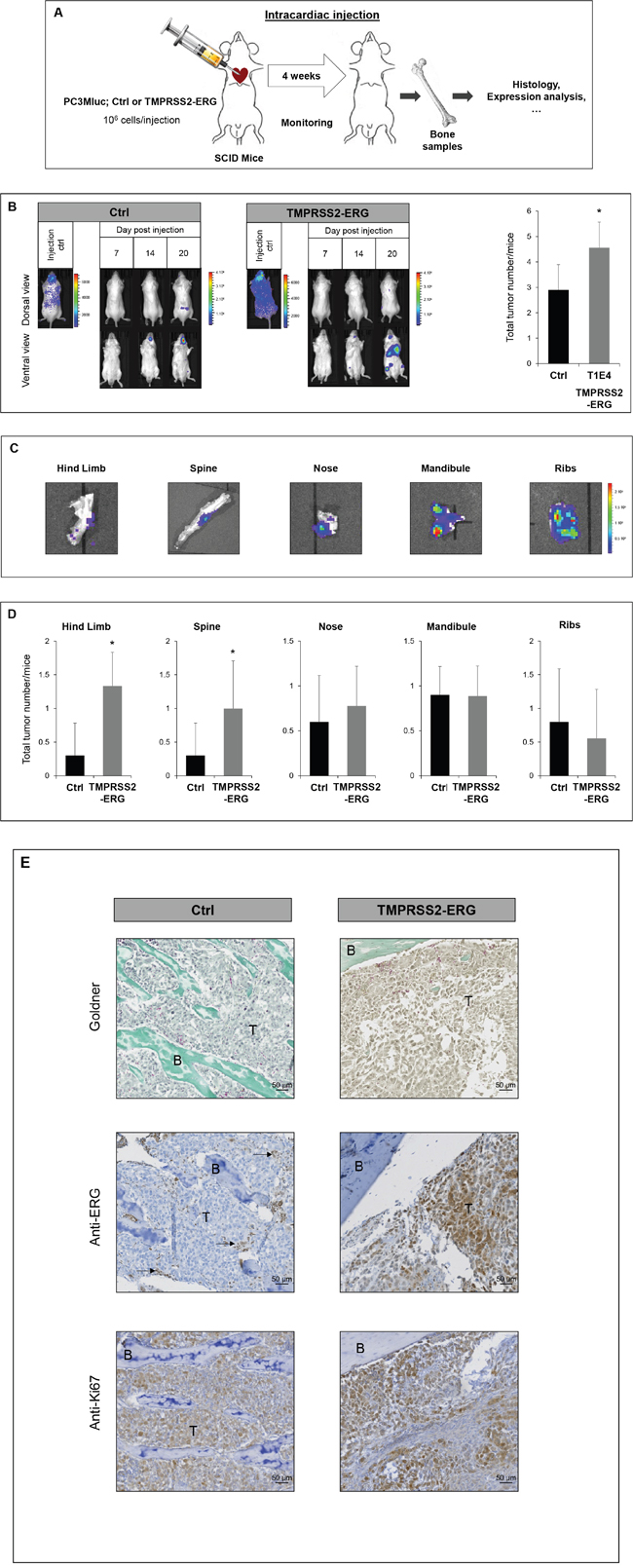 Figure 3: TMPRSS2-ERG fusion increases bone metastasis development. A. Schematic representation of intracardiac injection experiments. B. Bioluminescence imaging of SCID mice bearing PC3M-luc tumor cells (Ctrl or TMPRSS2-ERG). Left panel: Representative bioluminescence imaging of SCID mice on the indicated times after intracardiac injections. Right panel: Number of tumors per mice at indicated days after intracardiac injections. Data represents the mean of 10 mice in Ctrl group and 9 mice in TMPRSS2-ERG group. Luminescence is expressed in radiance (p/sec/cm2/sr) and represented by the color scale. * indicated p<0,05. C. Ex vivo detection of bone tumor by bioluminescence at day 24. Luminescence is expressed in radiance (p/sec/cm2/sr) and represented by the color scale. D. Number of tumors per mice in indicated organ sites at day 24 after intracardiac injections. Data represents the mean of 10 mice in Ctrl group and 9 mice in TMPRSS2-ERG group. * indicated p<0,05. E. Histologic analysis of bone tumors resulting from intracardiac injection of PC3M-luc Ctrl (left) or PC3M-luc TMPRSS2-ERG (right) by Goldner staining (top), with anti-ERG antibody (middle) and anti-Ki67 antibody (bottom). B=Bone, T= Tumor cells. Arrows indicate ERG positive vessels cells.