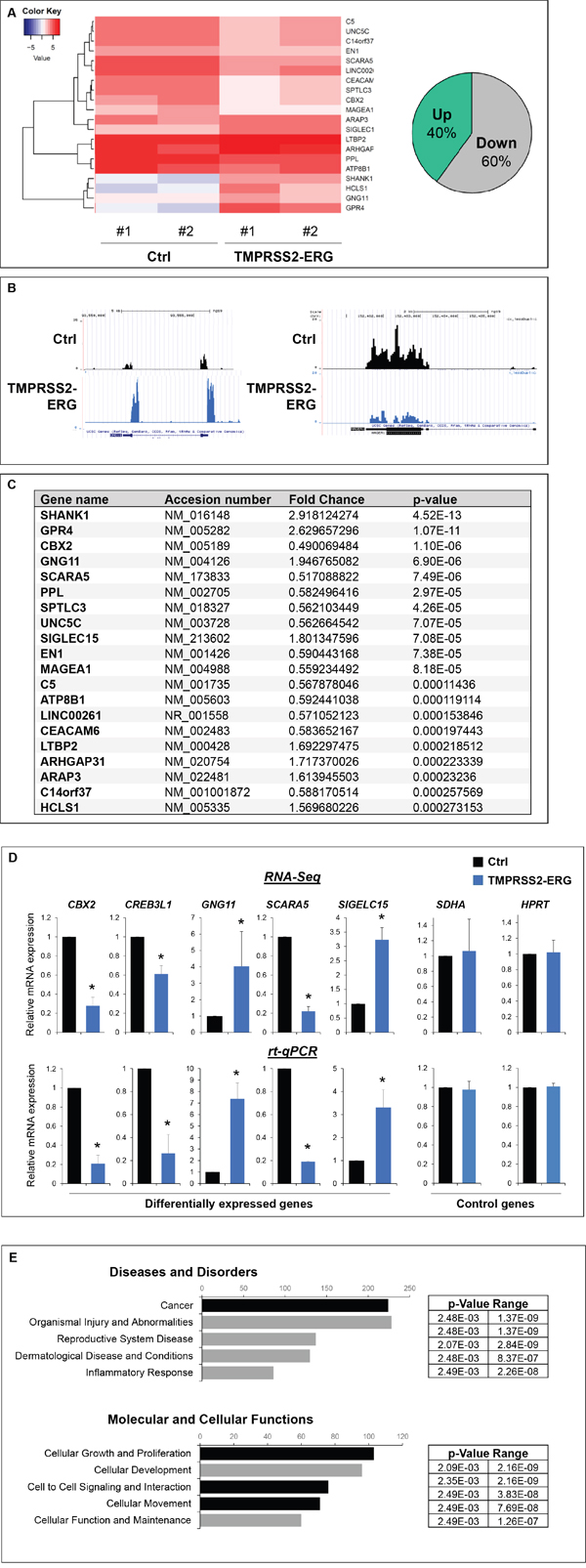 Figure 4: TMPRSS2-ERG fusion expression deregulates genes involved in cell migration, adhesion and skeletal physiology. A. RNA-sequencing analysis. Left panel, Heatmap showing top 20 of differentially expressed genes between PC3M-luc Ctrl and TMPRSS2-ERG cells. A technical duplicate was analysed for each sample (#1 and #2). The heatmap scale shows the range of expression level, whereby positive (red) and negative (blue) values correspond, respectively, to a higher and a lower expression. Right panel, pie chart showing the percentage of significatively (p value <0.05) up and downregulated genes in TMPRSS2-ERG cells versus control cells. B. Examples of RNA-Seq peaks (UCSC traks). C. Top 20 of significatively deregulated genes. D. Validation of expression changes observed in RNA-Seq by q-PCR. Results are normalized with respect to endogenous control GAPDH. E. Ingenuity pathway analysis (“Diseases and Disorders” and “Molecular and Cellular Function”) of the differentially expressed genes. The x axis represents the number of molecules per categories.