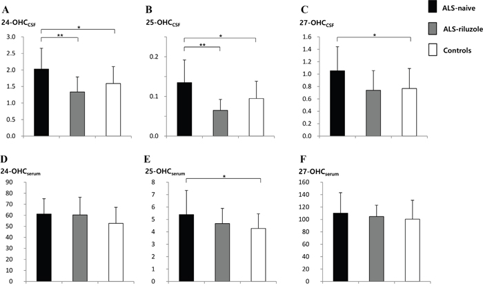 Figure 2: Levels of 24-, 25, and 27-OHC in the CSF and serum of ALS-naïve, ALS-riluzole, and control groups. The level of OHCs in the A-C. CSF and D-F. serum were compared between groups. The levels of (A) 24-OHCCSF and (B) 25-OHCCSF were significantly higher in the ALS-naïve group than both the ALS-riluzole and control groups. The level of (C) 27-OHCCSF and (E) 25-OHCserum were also higher in the ALS-naïve group than in controls. Data for OHCs were expressed in ng/mL. Abbreviations: ALS-naïve = ALS patients without treatment, ALS-riluzole = ALS patients on riluzole treatment, OHC = hydroxycholesterol, OHCCSF = OHC in the cerebrospinal fluid, OHCserum = OHC in the serum. *p < 0.05, **p < 0.01.