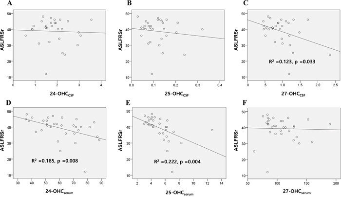Figure 3: Association of the OHCs with disease severity scores of patients with ALS. The association of the 24, 25, and 27-OHC in the A-C. CSF and D-F. serum of ALS patients with their ALSFRSr were assessed. Univariable linear regression analysis revealed that levels of 27-OHCCSF (C) 24-OHCserum (D) and 25-OHCserum (E) were significantly associated with the ALSFRSr of patients. Data for OHCs were expressed in ng/mL. Abbreviations: ALSFRSr = amyotrophic lateral sclerosis functional rating score revised, OHCCSF = OHC in the cerebrospinal fluid, OHCserum = OHC in the serum.