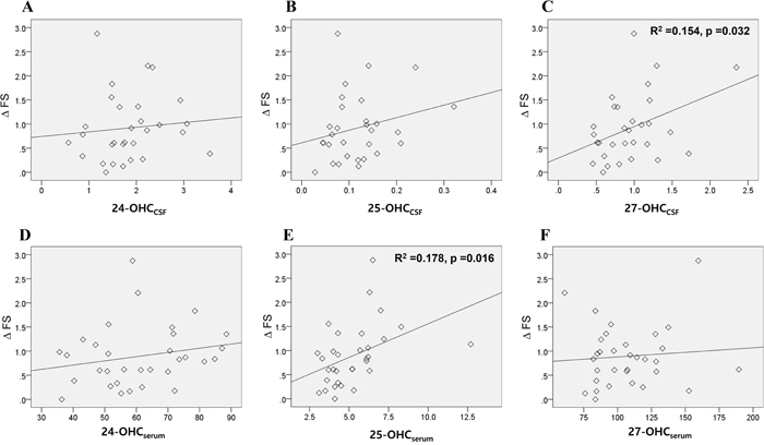 Figure 4: Association of the OHCs with disease progression rate of patients with ALS. The association of the 24, 25, and 27-OHC in the A-C. CSF and D-F. serum of ALS patients with their disease progression rate (ΔFS) were assessed. Univariable linear regression analysis revealed that levels of 27-OHCCSF (C) and 25-OHCserum (E) were significantly associated with the ΔFS of patients. Data for OHCs were expressed in ng/mL. Abbreviations: ΔFS = progression rate in amyotrophic lateral sclerosis functional rating score revised, OHCCSF = OHC in the cerebrospinal fluid, OHCserum = OHC in the serum.