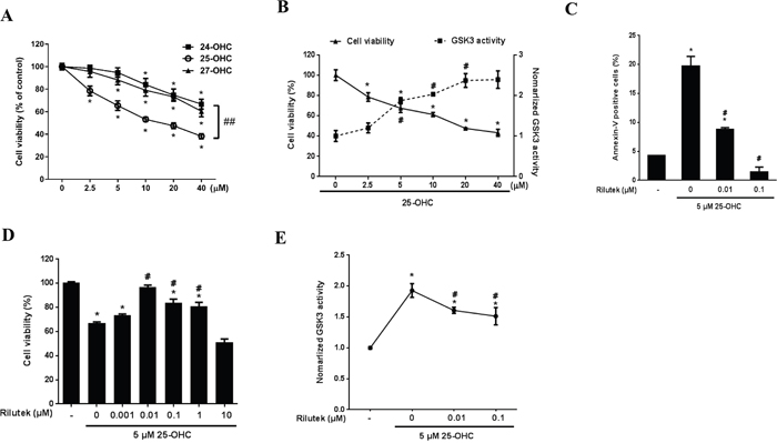 Among the three OHCs, the 25-OHC induced most severe motor neuronal death in a concentration of the 2.5uM to 40 uM (Figure 5A) in a motor neuronal cell line stably expressing mutant G93A superoxide dismutase 1 gene (mSOD1-NSC34) cells. It also activated the GSK pathway (Figure 5B) and induced cell apoptosis (Figure 5C). Riluzole reduced 25-OHC-induced apoptosis (Figure 5C), neuronal death (Figure 5D), and activation of GSK-3 (Figure 5E).