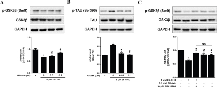 Figure 7: Inhibitory effects of riluzole on the 25-OHC-activated GSK3β pathway in motor neuronal cells. Western blot analysis, performed with antibodies against p-GSK3β (Ser9) and its substrate p-TAU (Ser396) revealed that 25-OHC activated A. GSK3β and B. subsequent tau pathway. C. Both the GSK-3 inhibitor (10 μM SB415286) and riluzole treatments reduced 25-OHC-induced GSK-3β activation. Compounded effects of combined treatment of t GSK-3 inhibitor and riluzole did not differ from the either of these treatments alone (C). Data are expressed as a ratio of the simultaneously assayed non-treated group's value and were compared using Tukey’s test after a one-way ANOVA (n=5). *p<0.05 when compared with non-treated group. #p<0.05 when compared with 5 μM 25-OHC treated group. NS, not significant.