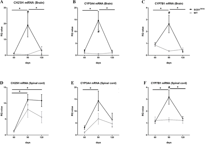 In the CNS, 25-OHC is mostly generated by the cholesterol 25-hydroxylase (CH25H) [9] and, to a lesser extent by the cytochrome P450 3A4 (CYP3A4) [10]. Whereas 25-hydroxycholesterol 7-alpha-hydroxylase (CYP7B1) is involved in the metabolism of 25-OHC [11]. To determine a potential mechanism for the observed increases in 25-OHC in ALS, we examined the mRNA expression of CH25H, CYP3A4, and CYP7B1 in the brain and spinal cord of transgenic mice with the human mutant SOD1 gene containing a glycine 93 (Gly93) to alanine (Ala) substation (mSOD1-G93A mice) at different time points (postnatal day of 60, 90, and 120) (Figure 9). In the asymptomatic stage (60 days), the mRNA expression of these enzymes in mSOD1G93A mice did not differ between ALS and WT mice. However, in the early symptomatic stage (90 days), mRNA expression of the 25-OHC synthesizing enzymes, CH25H and CYP3A4, was increased significantly compared to age-matched WT mice and asymptomatic mSOD1-G93A mice; these effects were primarily observed in brain tissue. The 25-OHC metabolizing enzyme, CYP7B1, was also moderately increased in the early symptomatic SOD1G93A mice, both in the brain and the spinal cord. Interestingly, these high levels of mRNA expressions of 25-OHC associated enzymes were only observed in the early symptomatic stage but not in the late symptomatic stage in mSOD1G93A mice.