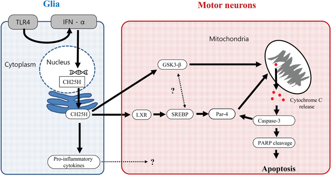 Among the three major OHCs, the 25-OHC induced most severe motor neuronal death in vitro model of ALS compared to the 24- and 27-OHC (Figure 5A). The 25-OHC is produced in the macrophage and/or glia by the enzyme CH25H [21, 22], in response to Toll-like receptor-4 (TLR-4) signaling [23] Moreover patients with ALS had increased expression of the TLR-4 in their glia of spinal cord. [24]. We speculate that this 25-OHC could mediate the motor neuronal death of ALS, via GSK3-ß and LXR pathway, in response to the upregulated the inflammatory signals of the glia (Figure 10).