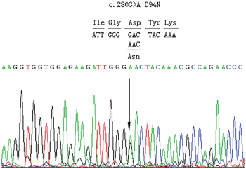 Figure 1: Partial sequences of exon 4 of PAX8 from an affected individual. The arrow indicates a heterozygous G>A transition at nucleotide 280 of the coding sequence of PAX8 (c.280 G>A), replacing an invariant aspartate residue by asparaginate at codon 94 in exon 4 (D94N).