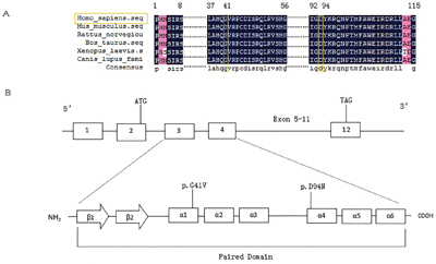 Figure 2: Sequence alignment of PAX8 from different species and schematic representations of the secondary structure elements of PAX8 paired domain. A. multiple sequence alignment of PAX8 from Homo sapiens, Mus musculus, Rattus norvegicus, Bos taurus, Xenopus laevis, and Canis lupus familiaris. The mutated residues, which are conserved among the different species, are colored in orange at 41 and 94 residues. Less conserved residues are colored in rose. B. Schematic representation of the secondary structure elements of PAX8 paired domain and the position of the G41V and D94N mutations in α-helix 3 and 5, respectively. The DNAMAN software was used in these analyses.