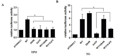 Figure 4: Luciferase activities of mutant PAX8 (D94N and G41V) in HeLa cells cotransfected with PAX8 expression vector (PAX8-WT; PAX8-D94N; PAX8-G41V; PAX8 WT and D94N; PAX WT and G41V) along with TG-Luc or TPO-Luc. The ratio between measured firefly and Renilla luciferase activities was expressed relative to the ratio obtained in cells transfected with reporter and empty expression vector (pcDNA3.1) only. A. The increase in luciferase activity by WT PAX8 significant compared with G41V, D94N, WT and G41V, WT and D94N group. Failure of the D94N and G41V mutants to activate TPO transcription; Both D94N and G41V had a dominant negative effect on the wild-type PAX8. B. The increase in luciferase activity by WT PAX8 significant compared with cells transfected with G41V, WT and G41V. Failure of the mutant PAX8-G41V to activate TG transcription, but normal D94N activation of TG transcription; G41V had a dominant negative effect on the wild-type PAX8. WT, wild type. *P<0.05.