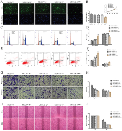 Figure 2: Domain-lacking weakened the role of MUC4/Y on malignant activities of PANC-1 cell. A and B. The altered DNA replication ability was determined by the EdU incorporation assay at various MUC4/Y-domains-lacking groups and the control group. The cells growth rates were determined by CCK-8 proliferation assays at various time points. Cell growth rate = point-in-time of the absorbance at 450 nm(A450) / Mean of A450 in 24h. C and D. Cell cycle distribution was analyzed by using flow cytometry with PI staining. The percentages of cells at the G0/G1 & S & G2/M phase were plotted. E and F. Representative templates of FCM analysis showing the proportion of cells positive for annexin V(-APC) and 7-AAD (top right quadrant) representing the percentage of necrotic cells; the proportion of cells that were annexin V(-APC)–positive and 7-AAD–negative (bottom right quadrant) represented the percentage of apoptotic cells. Bar denotes the percentage of apoptotic and necrotic cells in PANC-1–derived clones. G and H. Metastatic potential in vitro was detected by matrigel migration and invasion assay. Bar graph shows the number of PANC-1–derived clones that had migrated or invaded through the Matrigel. I and J. Migration capability was detected by wound healing assay. Wound closure was delayed in different groups at 24 h. Occupied area of wound closure by migrated cells was calculated and is depicted in the bar chart. “*”(P<0.05), “**”(P<0.01), and “***”(P< 0.001) indicate a significant difference from PANC-1-MUC4/Y control cells.