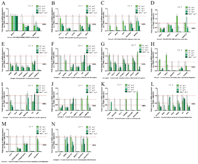 Figure 5E-5F show the reverse-effect rate or extent of different domains-lacking at mRNA level verified by QPCR. As shown in Figure 3, representative downstream effector molecules of MUC4/Y were classified as twelve feature subsets, i.e. group1-12. Group1-5 can be incorporated as a feature subset of crucial factors involved in signaling hub. Group 6 is a feature subset of extracellular growth factors & membrane receptors. Group7-9 can be incorporated as a feature subset of crucial factors involved in oncogenic function. Group10-12 can be incorporated as a feature subset of crucial factors involved in energy metabolism (Mitochondrial function) and protein synthesis & modification including glycosylated modification (Golgi function). Figure 5E shows positive proportion of genes number of expression-reversed at group N△, A△, V△, NAV△, as follows: 1) Group1-5: 95.45% (21/22), 95.45% (21/22), 100% (22/22), 100% (22/22), respectively. 2) Group 6: 84.61% (11/13), 100% (13/13), 100% (13/13), 92.31% (12/13), respectively. 3) Group7-9: 73.91% (17/23), 95.65% (22/23), 100% (23/23), 91.30% (21/23), respectively. 4) Group10-12: 100% (18/18), 100% (18/18), 100% (18/18), 100% (18/18), respectively. Figure 5F shows positive proportion of greater than 50% reversal rate at group N△, A△, V△, NAV△, as follows: 1) Group1-5: 63.64% (14/22), 72.73% (16/22), 86.36% (19/22), 95.45% (21/22), respectively. 2) Group 6: 46.15% (6/13), 61.54% (8/13), 61.54% (8/13), 84.62% (11/13), respectively. 3) Group7-9: 56.53% (13/23), 69.57% (16/23), 82.61% (19/23), 91.30% (21/23), respectively. 4) Group10-12: 55.56% (10/18), 77.78% (14/18), 72.22% (13/18), 77.78% (14/18), respectively.