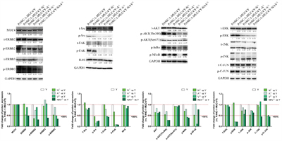 Figure 4: Domain-lacking reduced protein expression level of key nodes of MUC4/Y-mediated signal path in the majority. Representative signaling pathways mediated by MUC4/Y were described as earlier research [16] (Additional File 4, Supplementary Figure S1). WB validation results of the expression changes of the key nodes in the signal path and measurement of optical density value by Image J software. The expression quantity in controls is defined as 1.0, so under the line of “1.0” represents mean expression quantity of experimental groups below that of control group, and under the line of “0.5” represents mean expression quantity of experimental group less than 50% expression of control group.