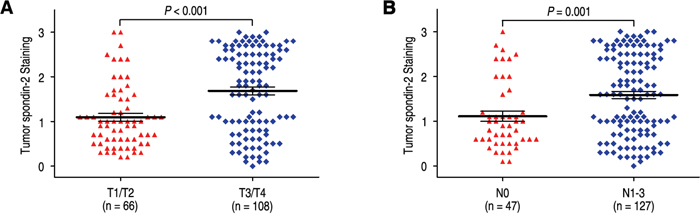 To investigate the biological significance of Spondin-2 in gastric cancer, we detected the expression of Spondin-2 in 174 gastric cancer tissues (tumor and matched adjacent non-tumorous tissues) by immunohistochemistry. Spondin-2 staining mainly located in cytoplasm of tumor cells (Figure 1a). Overexpression of Spondin-2 was observed in 87 of 174 (50.0%) of gastric cancer samples, compared with 34/174 (19.5%) in adjacent non-tumorous tissues (P < 0.001; Figure 1b). The results suggested that Spondin-2 expression was significantly higher in gastric cancer than that in adjacent non-tumorous tissues.
