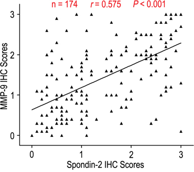 Both the extent and intensity of immunostaining were taken into consideration when analyzing the data. The intensity of staining was scored from 0 to 3, and the extent of staining was scored from 0% to 100%. The final quantitation of each staining was obtained by multiplying the two scores. Spondin-2 expression was classified as high expression if the score was higher than the median score of 1.1, if the score was 1.1 or less, the case was classified as low expression. MMP-9 expression was considered high if the score was higher than 1.4 (Supplementary Figure 1).
